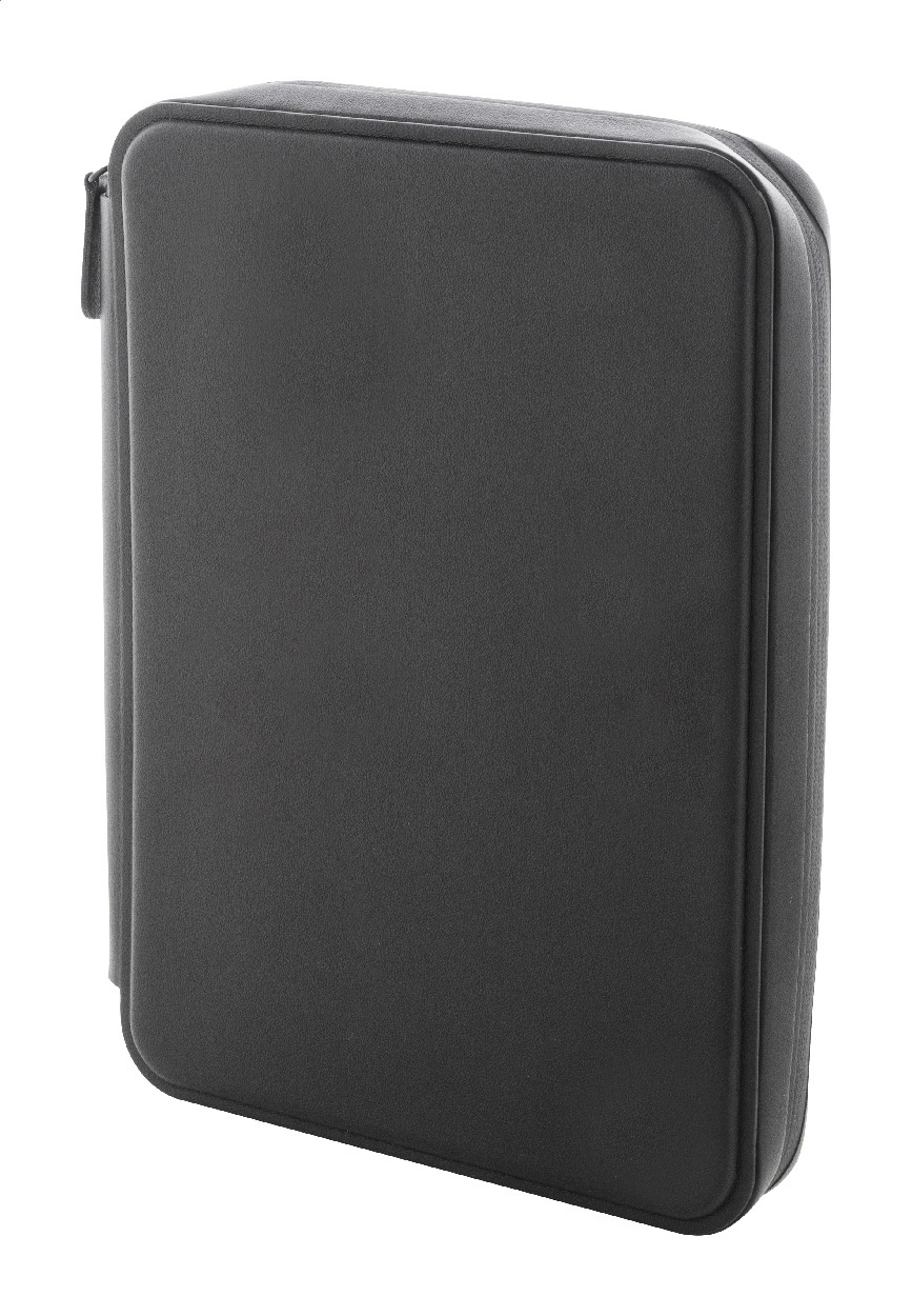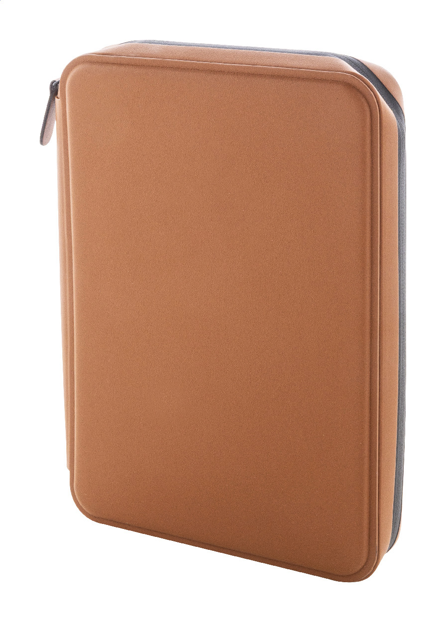Cipzáras, luxus iratmappa újrahasznosított PU bőrből, 64 újrahasznosított papír anyagú, vonalas lapos jegyzetfüzettel. Több belső zsebbel kártyáknak és dokumentumoknak. A5 méret.