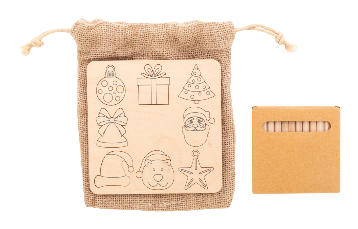 Karácsonyi színezős formakereső játék rétegelt nyírfából, juta tasakban. Tematikus kivágott figurákat (8 db) és fa színes ceruzákat (12 db) tartamaz, papírdobozban.