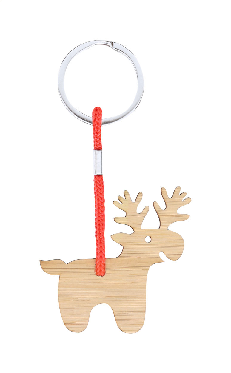 Bambusz rétegelt lemez karácsonyi kulcstartó piros zsinórral és fém karikával.