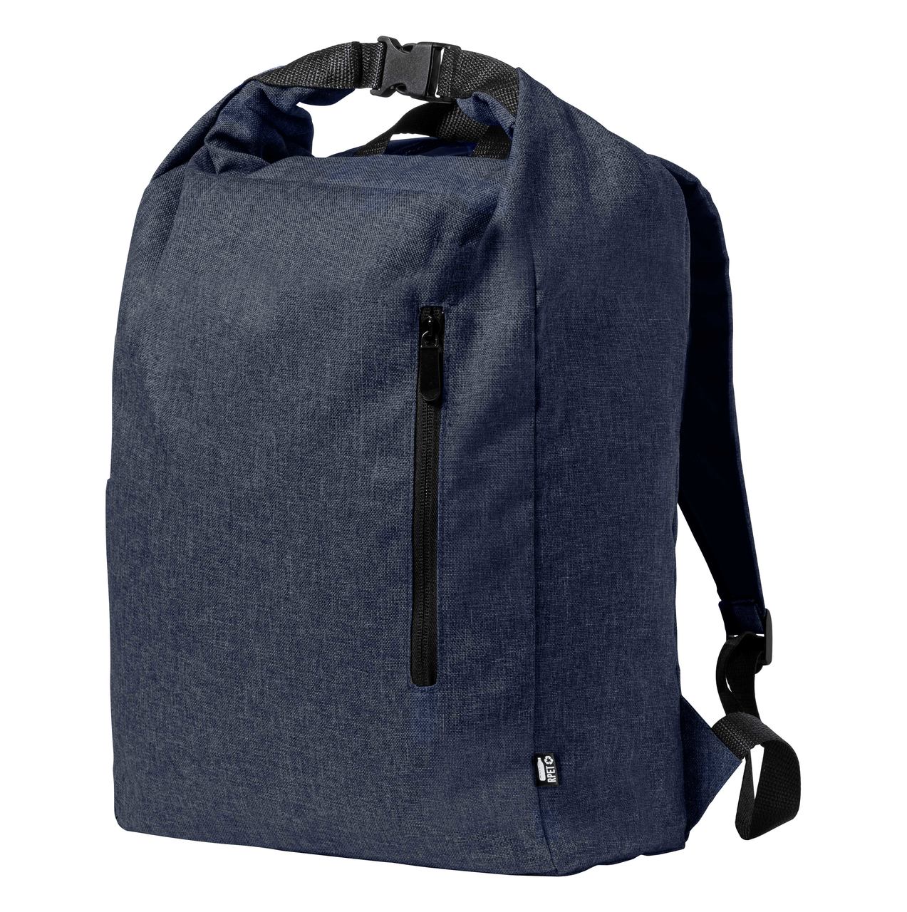 Vízálló, RPET hátizsák oldalzsebbel, cipzáras első zsebbel, párnázott hát- és vállpánttal. Megkülönböztető RPET címkével. 300D RPET poliészter.