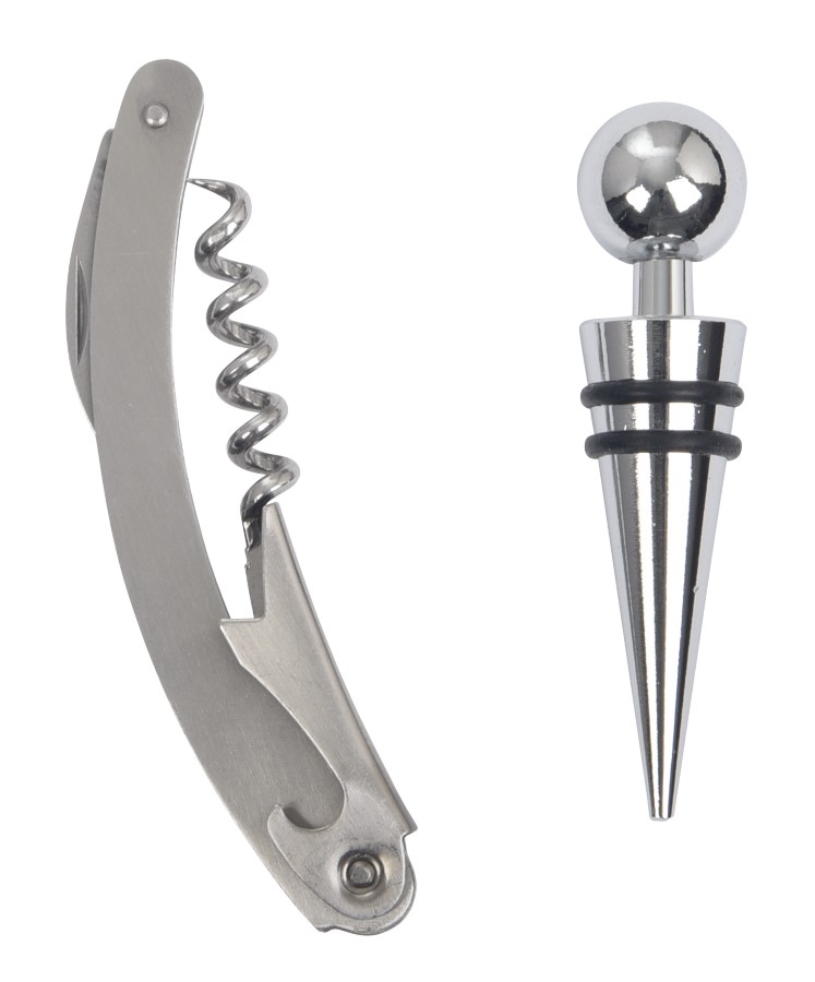 DUET boros készlet fekete kartondobozban, dugóhúzóval, bornyitóval, fóliavágóval és palack visszazáró dugóval