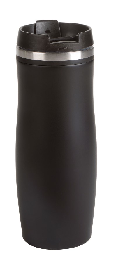 DARK CREMA duplafalú termosz bögre: kívül és belül rozsdamentes acél, műanyag fedél biztonságos csavaros mechanikával és kihajtható záras beépített nyílással az iváshoz, színes gumigyűrű a felső részen és gumiborítású talp a kiváló tapadás érdekében, kapacitása kb. 400 ml