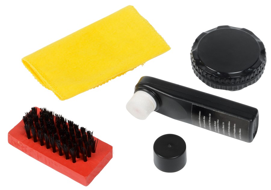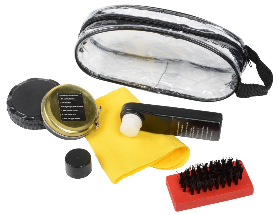 SMALL SHINE cipőpucoló készlet: fanyelű kefével, polírozó kendővel (kb. 23 x 10 cm), színtelen cipőápoló olaj szivaccsal, színtelen szilikon olaj szivaccsal, átlátszó cipzáras tasakban