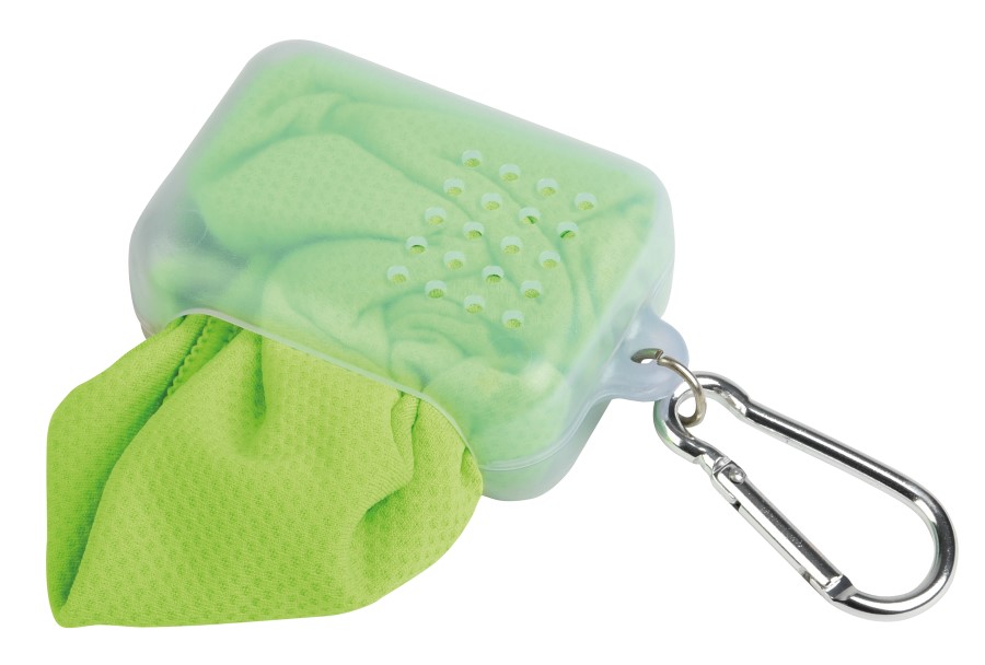 CHILLING hűtő törölköző: átlátszó dobozban, integrált napvédő funkció, a hosszan tartó hatás érdekében vizezze be kendőt, majd csavarja ki, vagy a dobozában töltse fel vízzel és rázza össze, a doboz színben hozzáillő karabinerrel - ideális fitnesz és egyéb sport tevékenységekhez