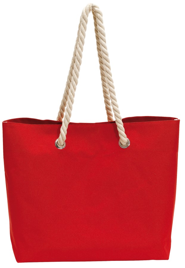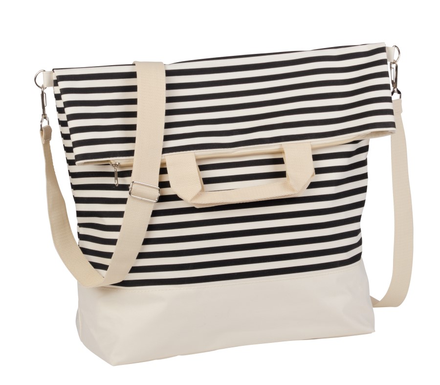 SYLT strandtáska csíkos kivitel: tágas főrekesz tépőzárral, további cipzáras zseb az értékek, kulcsok számára, 2 db fonott zsinóros fül, fém díszítéssel a lyuknál