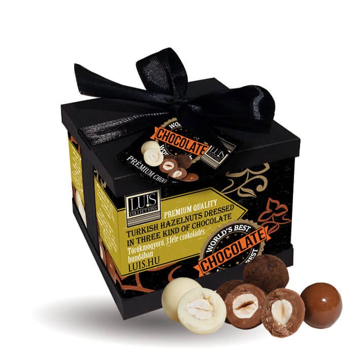 Törökmogyoró, 3 féle csokoládés bundában – díszdobozban