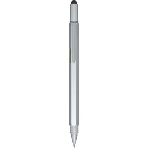 A Dora alumínium multifunkciós golyóstoll részben újrahasznosított anyagokból készült, és tartalmaz kétoldalas vonalzót, csavarhúzót, vízmértéket, valamint egy fekete gumiból készült érintőt. A tollteste újrahasznosított alumíniumból készült, ezüst spray bevonattal. A klipsz vasból, a csavarhúzó acélból, a felső rész és a hegy pedig újrahasznosított ABS anyagból készült. Fekete tollbetéttel. Írási hossz: 400 méter. Tollhegy mérete: 1,0 mm.