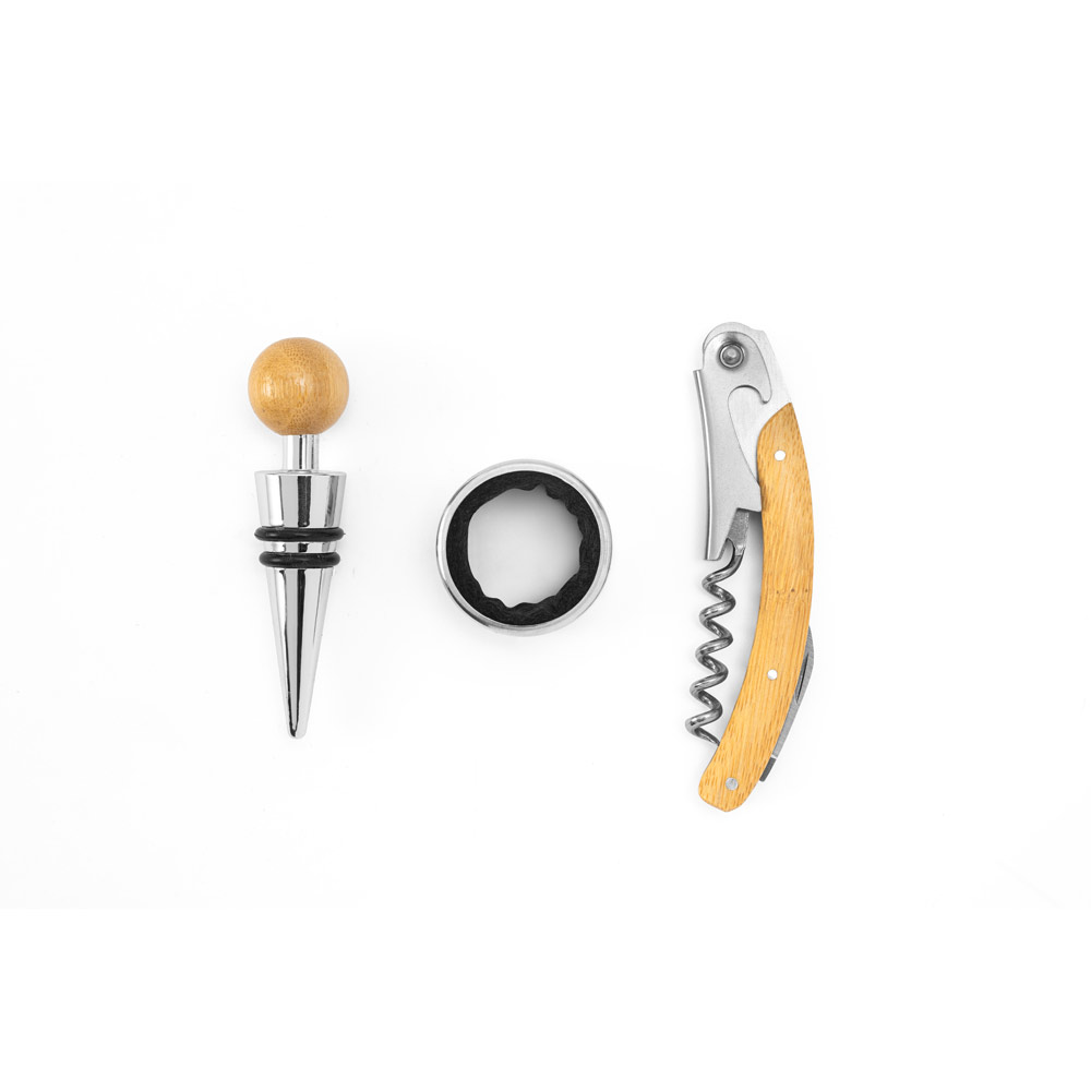 Bambusz és rozsdamentes acél boros készlet. Tartalma: 1 dugóhúzó, 1 dugó és 1 fémgyűrű. Kraft papír ajándékdobozban szállítjuk. Mivel ez a termék természetes anyagokból készül, a termék színe és nyomtatása termékről termékre eltérhet. 160 x 100 x 27 mm
