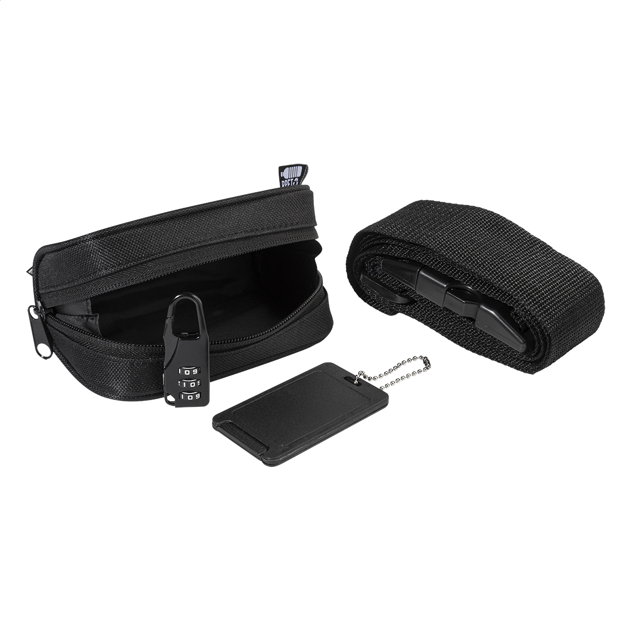 3 részes utazó szett cipzáras RPET tokban. Tartalmaz egy poliészter bőröndövet 3 számjegyű zárral, PP bőröndcímkét és fém 3 számjegyű bőröndzárat. 600D RPET poliészter, megkülönböztető RPET címkével.